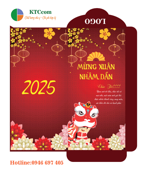 KTCCOM cung cấp dịch vụ in bao lì xì theo yêu cầu, hỗ trợ thiết kế riêng theo phong cách thương hiệu – từ màu sắc, họa tiết cho đến vị trí logo. Bao lì xì được in bằng công nghệ offset nhiều màu sắc nét, đảm bảo mỗi chi tiết đều tinh tế, sang trọng và nổi bật.